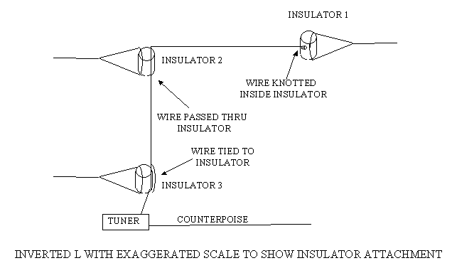 The figure on the back of this sheet shows some detail on the inverted L. The three insulators are used as follows. One is used at the far end to attach to the support line. The end of the wire is already passed through a hole in the insulator and knotted. The support line can be simply run through the insulator and tied in a common “granny” knot. The antenna wire is run thorough the second insulator and not tied. The second support line also is passed through, but tied to the insulator. This allows the antenna wire to "free float" for ease of erection. The third insulator is tied to the lowest part of the antenna and another support line is passed through the insulator and tied off to a support. The free end of the wire goes to the antenna tuner.