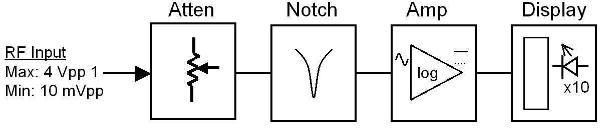 An input signal in the HF range, as high as 4 Vpp down to 10 mVpp, is fed to the input. The signal is attenuated and passed through a notch filter to attenuate the fundamental signal. All other components (harmonics of the fundamental and undesirable higher frequency spurious signals) are allowed to pass on for measurements. A logarithmic detector then senses this remaining energy in the spectrum and feeds a bargraph display to show the cumulative amount of remaining off-frequency signals.
