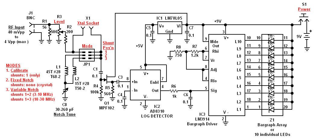 This DC output of the log detector is filtered by a simple RC circuit then fed to IC3, an LM3914 LED display driver IC. The LM3914 uses an internal series of voltage dividers, voltage comparators and an precision voltage reference to control a bargraph style display in response to the input DC signal. With the chosen values of R7 and R8 this means that the lowest output L1 turns on with a 120 mV input, L2 also then turns on turn at 240 mV and so on until all outputs are turned on with an input of 2.50 V. IC3 then drives a bargraph array Z1, or an equivalent number of discrete LEDs to provide a visual display. The combination of the log detector chip and the LED driver chip produce a bargraph display over a 50 dB range in ten 5 dB steps.