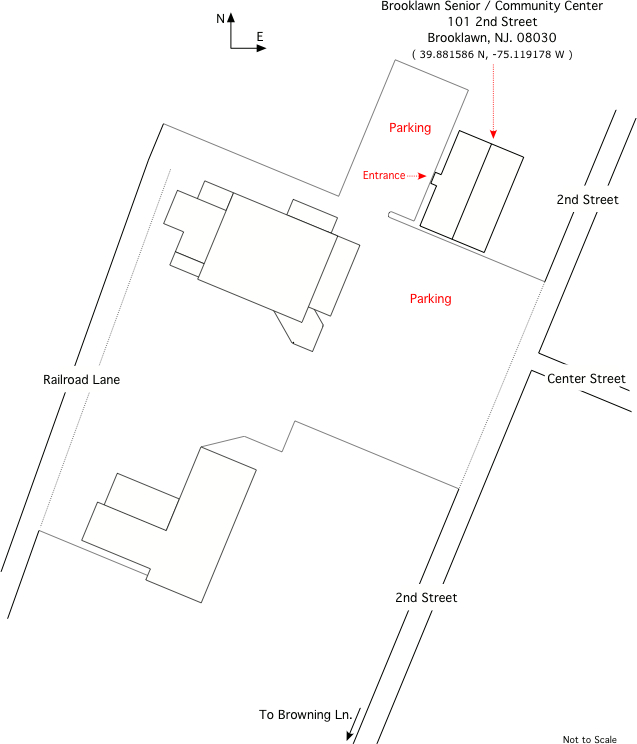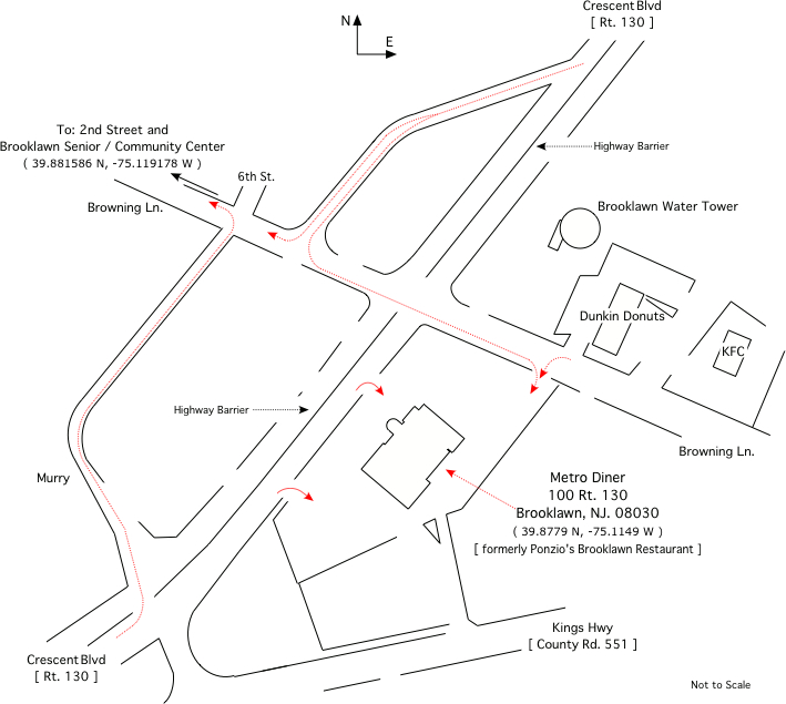 2. From Northern NJ areas - Take Rt 95 (NJ Turnpike) south to Exit 3 Rt 168 (North Black Horse Pike). Turn right onto Rt 168 and go 0.3 miles to West Browning Rd (or Ln). Turn left on West Browning and go about 2 miles to Rt 130. (See the "Metro Diner" on corner - the location of our pre-meeting breakfast.) Cross Rt 130 on Browning and go 5 short blocks to 2nd Ave. Turn right and the Brooklawn Community Center is a couple hundred yards on the left at the far end of an asphalt parking lot. Plenty of parking.